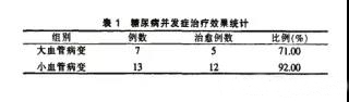 2.2糖尿病并發(fā)癥治療效果統(tǒng)計(jì)高壓臭氧大自血療法治療后大血管病變7例中5例治愈,小血管病變13例中12例治愈。結(jié)果見下表。